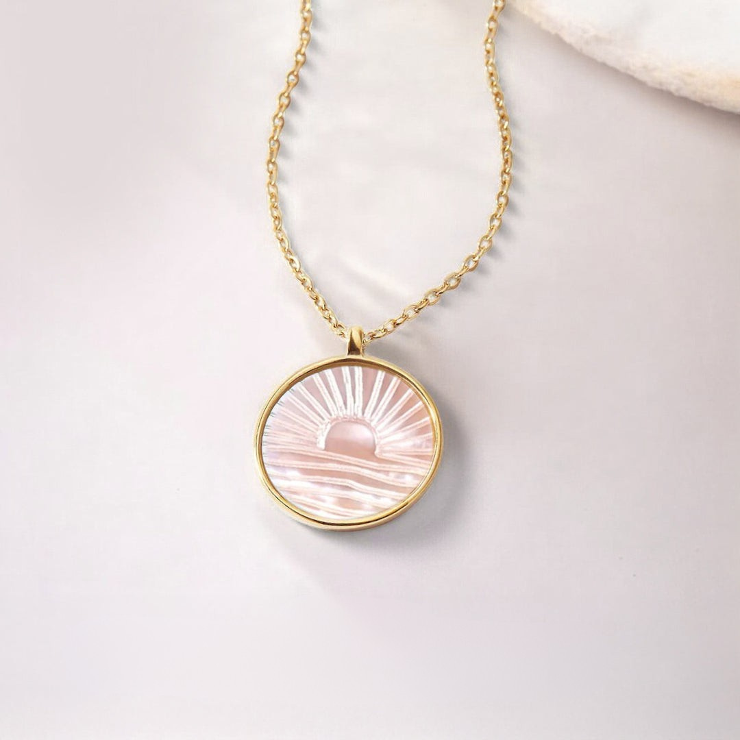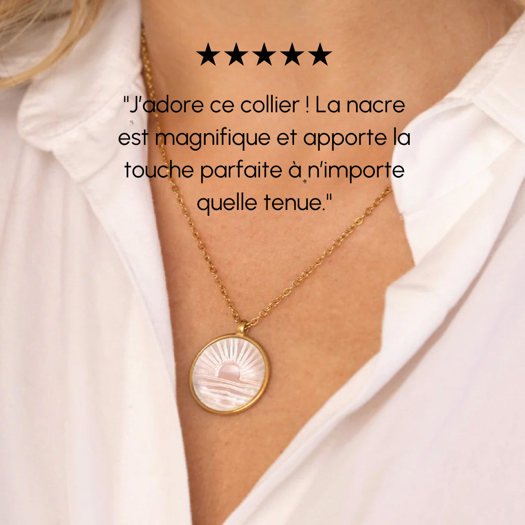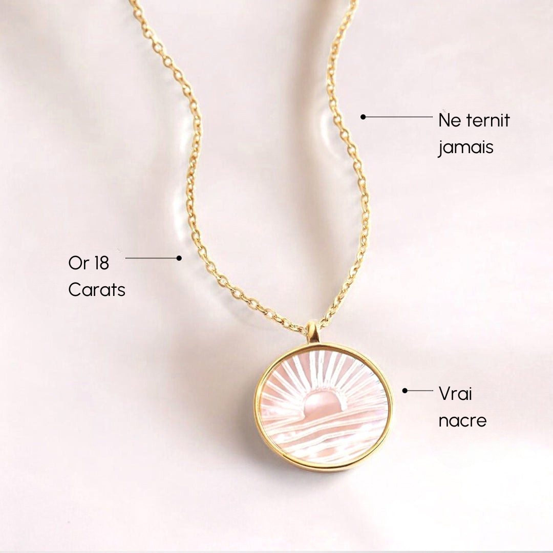 Un pendentif en nacre aux reflets chauds, inspiré d’un coucher de soleil.