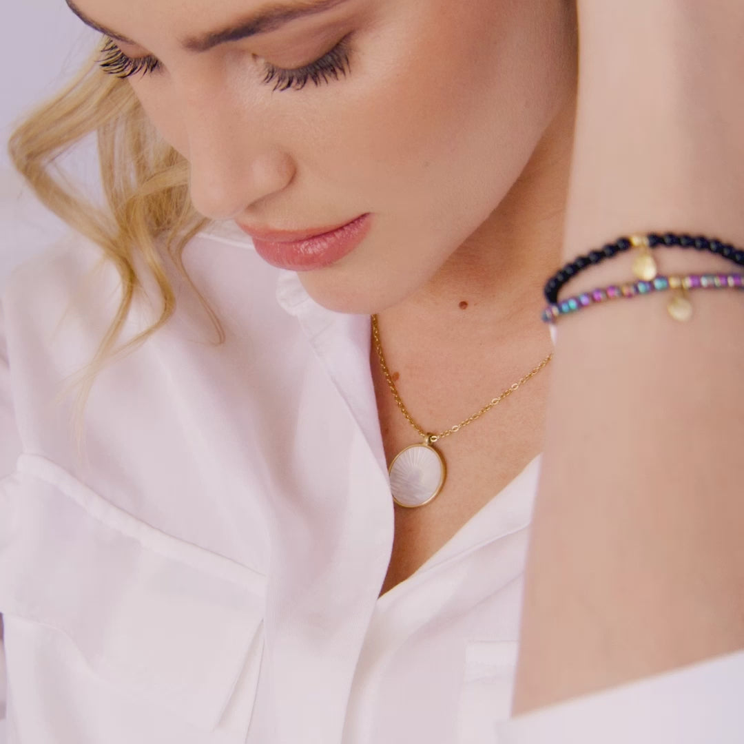 Plaqué or 18k sur acier inoxydable chirurgical 316L – hypoallergénique, résistant à l’eau et à l’oxydation. Nacre.